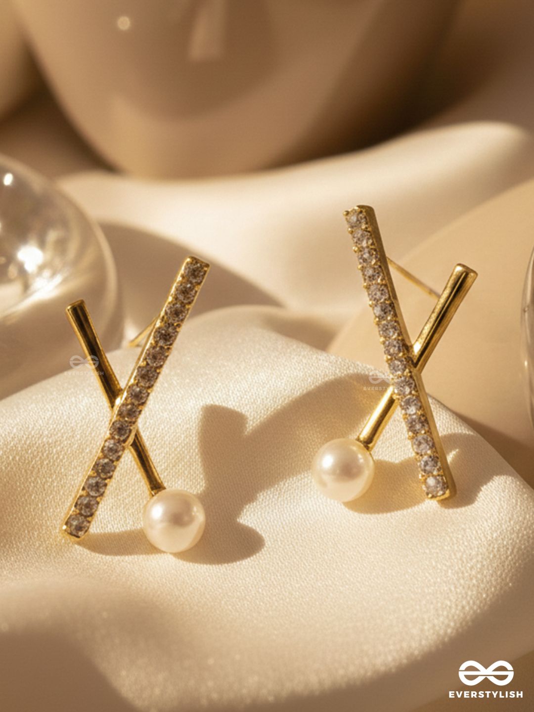 Star Crossed- Rhinestones Studded Pearl Golden Earrings
